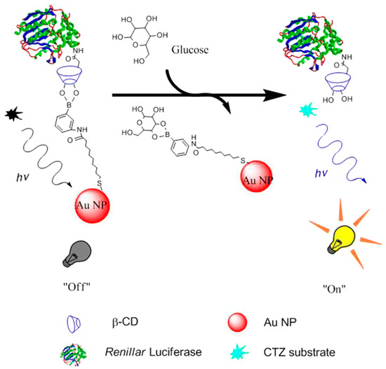 BRET has revolutionized the detection of small molecules and PPIs. Some techniques utilize a quenching mechanism whereby the acceptor molecule accepts the fluorescence of the donor molecule and quenches the signal. In one particular sensor, gold nanoparticles were used to quench the bioluminescence from RLuc [24]. When the sensor was bound to glucose, the gold nanoparticles could no longer quench the signal, therefore bioluminescence was restored (Figure 2). The intensity of the signal could then be correlated to the concentration of the glucose in a sample.