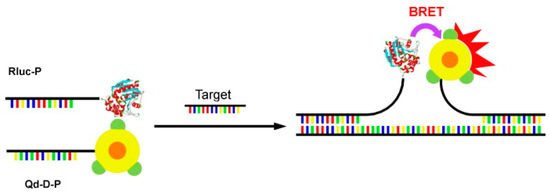 Schematic of BRET based on-type sensing system. The Rluc-P and Qd-D-P hybridized to the target in head-to-head fashion permitting BRET between Rluc and Qd. Reprinted from [55], with permission from Elsevier.
