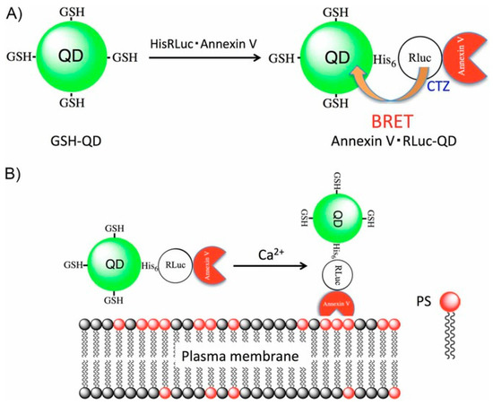 (A) Synthetic method for the preparation of recombinant protein (HisRLuc-annexin V)-conjugated QDs (annexin V-Rluc-QDs). (B) Schematic representation for the binding of annexin V-RLuc-QDs to PS on plasma membrane of apoptotic cells in the presence of Ca2+ ions. Reprinted with permission from [56]. Copyright 2017 John Wiley and Sons.