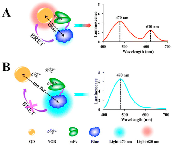 (A) In the absence of free FQs, QD-NOR is recognized by scFv-Rluc and the Rluc and QDs are in close proximity; energy is released from the substrate and transferred to the QDs via BRET. (B) In the presence of free FQs, the scFv-Rluc binds to the free FQs and the distance between the Rluc and QDs is too far to realize energy transfer. Reprinted with permission from [57]. Copyright 2016 American Chemical Society.
