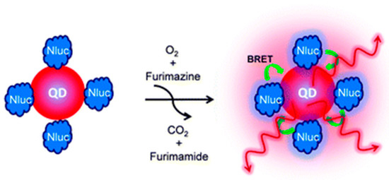 Typically, BRET sensors utilize fluorescent proteins [3,5,25,26,27] or organic dyes [28,29,30] as acceptors. However, recent studies report the use of nanoparticles such as quantum dots (QD) to be effective. QDs have the advantage of adjustable emission depending on size, superior brightness, high photostability, and multiplexing [31,32]. Fluorescent semiconductor quantum dots were previously limited in their application for in vivo imaging due to requiring excitation from an external source of light [5,6,7,8]. Combining QDs with luminescence provided by bioluminescent proteins has provided opportunities for in vivo imaging [7]. This review will offer some insight into the many applications of BRET-QDs.
