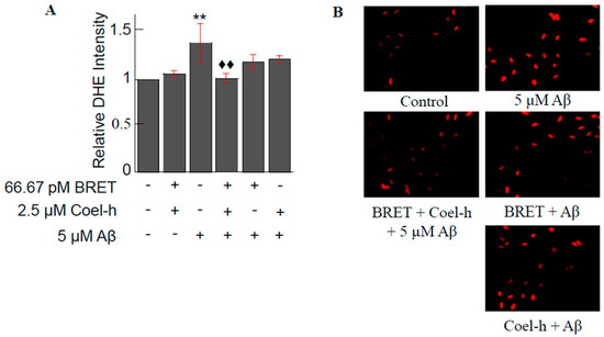 BRET-QD with coel-h pretreatment on Aβ-induced superoxide anions production. (A) Aβ treatment increased the fluorescent intensity of DHE by 40% as compared to control. The pretreatment of BRET-QD (66.7 pM) and coel-h (2.5 μM) suppressed the Aβ-induced increase in superoxide anion production back to that of control. Both the BRET-QD and Coel-h alone pretreatment lowered Aβ-induced superoxide anion, but not with a statistical significance. (B) Fluorescence images representing each experimental group. Each experiment was repeated three timesas compared to 5 μM Aβ. Data of each treatment group were normalized by the control for each independent experiment prior to statistical analysis. Reprinted from [92], with permission from Elsevier.