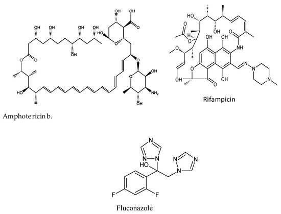 The chemical structures of amphotericin b (Amp b), fluconazole (Flu), and rifampicin (Rif). As depicted, each of these drugs have unique structural features that can influence membrane integrity.
