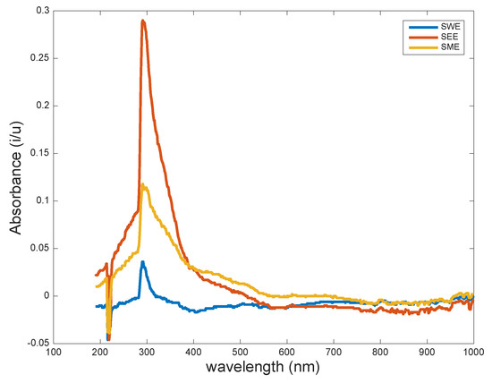 The UV/VIS monitoring of the extracts showed that SEE and SME were very efficient in removing the bioactive compounds, whereas SWE revealed the least as shown in Figure 3. As expected, the lower absorbance value from the water extracts was presumably due to the fact that either most of the hydrophobic compounds could not be extracted into the aqueous phase, or the bioactive compounds were not UV/VIS active. Methanol and ethanol, however, were more efficient in extracting the bioactive molecules resulting in higher peak absorbance intensities. Nonetheless, the major UV/VIS absorbance wavelengths were in the same range (290–293 nm) for all the extracts and confirmed previous studies of D. reflexa—that extracts had unique wavelength characteristics in the presence of antioxidants, phenolic compounds, alkaloids, flavonoids, cinnamaldehydes, benzene, and lignin derivatives [14,23,24].