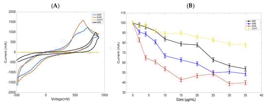 To test the electrochemical behavior and redox activity of the extracts, cyclic voltammetry analysis was conducted using interdigitated gold electrodes (IDEs), (Metrohm, DropSens). Briefly, the IDEs were composed of two interdigitated electrodes with two connection tracks on a glass substrate and offered several advantages, such as working with low volumes of samples and avoiding tedious polishing of solid electrodes. There were no redox peaks observed from the bare electrodes, as shown in Figure 4A (CONT, yellow), however, all the extracts showed quasi-reversible oxidation processes in 0.1% DMSO with current values that ranged from 0.10 to 0.18 mA at a scan rate of 10 mV/s, as shown in Figure 4A for SWE, red; SME, blue; and SEE, black. The SWE exhibited a higher oxidative peak current, which was shifted to the left, probably indicating that most of the bioactive compounds were oxidative species compared to those in the SEE and SME extracts. The corresponding concentration-dependent cell viability studies were conducted for each extract, and the results are shown in Figure 4B. It was observed that SWE (red) demonstrated the most cell death, followed by SME (blue) and SEE (black), and the untreated cells CONT (yellow) exhibited the least cell viability with concentrations up to 30 µg/mL and an incubation time of 8 h. It was noted that prolonging incubation beyond 8 h resulted in programmed cell death, and the cell counter continually indicated error messages.