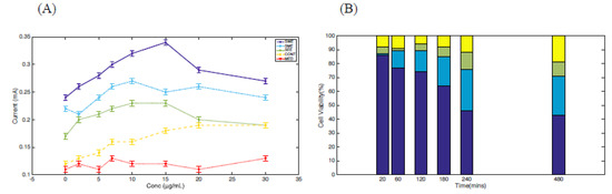 There are numerous redox mediators that are used to either study cell redox activity or develop biosensors for many biological systems. For example, S. cerevisiae has several redox centers, such as [Fe(CN)6]3−/[Fe(CN)6]4− and NAD(P)H/NAD(P)+, which can be targeted by hydrophilic/hydrophobic molecules, as extensively discussed previously by Rawson et al. [35,36]. In addition, electrochemical monitoring can be conducted when reactive oxygen species are released as a result of drug-induced action [32,37,38,39,40]. Reactive oxygen species is a term used to describe oxygen species, including superoxide anion radical (O2•−) and hydrogen peroxide (H2O2), and they can cause cytotoxic and antimicrobial effects in most organisms. Thus, there are at least three main mechanisms of drug action including, but not limited to, membrane depolarization leading to an influx of ions (as in the case of Amp b), targeting of redox centers, and/or the release of ROS in S. cerevisiae [28,35,36,41]. Amp b has been used to treat fungal infection, and the mechanism through which the antifungal drug kills infected cells is well-characterized using both biophysical and microbiological techniques [22,25]. The antifungal drug binds to ergosterol and forms pores at the cell membrane, causing the loss of ions and leading to depolarization of the membrane [13,21]. This mechanism can cause an enhanced oxidation potential, which can be captured through electrochemical detection, as already observed in our studies as well as studies from other groups [25,36].
