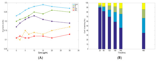 (A) Concentration-dependent profile of the change in anodic current as a function of drug concentration (amp b, blue; Rif, green; Flu, purple; untreated cells, CONT, yellow; and medium, MED, red) after 8 h of drug administration. (B) Percent cell viability at 15 µg/mL extract concentration with data recorded from 20 min to 8 h using trypan blue as a staining dye. Reproducibility of the data was analyzed using triplicate measurements.