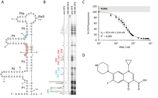 The chemical structure of CFX is shown in Figure 1D. As all fluoroquinolones, it consists of a quinoline carboxylic acid backbone. Upon binding to the aptamer, the intrinsic fluorescence of CFX is quenched. By measuring the decrease of the fluorescence as a function of RNA concentration in the presence of CFX, a dissociation constant (KD) for the RNA-ligand complex of 31 nM was determined.