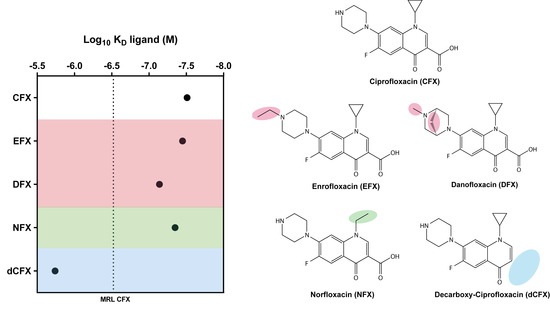 Specificity of the molecular recognition of the CFX-binding aptamer R10K6 and its impact on the dissociation constant. Left: Plot of the Log10KD-values (M) of CFX and CFX-derivatives. The maximum residue limit (MRL) for CFX in milk samples is marked as a dotted line [23,24]. Right: Chemical structure of CFX and CFX derivatives. Changes relative to CFX in the chemical structure are shaded.