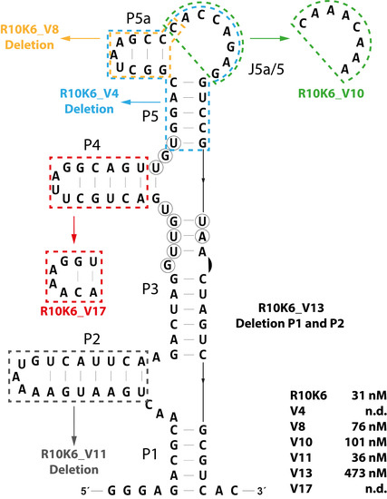 Finally, the R10K6_V11 was revealed as the most functional mutant. It represents a shorter version of the aptamer R10K6 without loss of ligand binding affinity. In comparison to R10K6, R10K6_V11 is shortened by 19 nts and has a final length of 84 nts. The determined dissociation constant of 36 nM for V11 is similar to the original full-length aptamer R10K6 (31 nM).