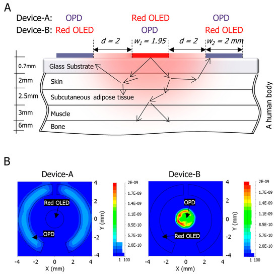 In order to get the best OLED and OPD design for improving the power consumption and quality of the signal, a simplified finger model and OLED/OPD model were simulated optically by LightTools software (Synopsys, Inc., California, USA). The simulator traces the light rays using the ray-tracing method in combination with the Monte Carlo method, where two opposite design structures of the pulse meter were simulated: Device-A and Device-B. The finger model was simplified into a four-layer structure of skin, subcutaneous adipose tissue, muscle, and bone. The optical parameters of these layers were approximated from the literature in [28,29,30,31]. The thickness of each layer was approximately assumed as 2 mm, 2.5 mm, 3 mm and 6 mm, respectively. The distribution of the light rays from the OLED into the human body and the reflection on the OPD were illustrated in Figure 2A. The pulse meter model was composed of a light object source (625 nm) that represented the red OLED, and a surface receiver that represented the OPD.