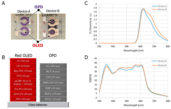 (A) Top view of the fabricated optoelectronic Device-A and Device-B; (B) The organic device structure of the OLED and OPD; (C) Electroluminescence spectrum of the OLED with respect to the wavelength (nm); and (D) External quantum efficiency (EQE) of the OPD with respect to the wavelength (nm).