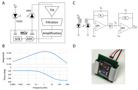 The generated photocurrent from the OPD, as a response of the reflected light from the blood vessels, is a very small amount in the nanoampere range, which requires a current-to-voltage converter such as a TIA to translate the current output of the OPD to a voltage signal in the first stage of the analog circuit. The TIA should have a low input impedance and low output impedance to avoid impedance mismatch in the circuit. It offers a low impedance to the OPD, and isolates it from the output voltage of the operational amplifier [34,35]. The next stage is the analog filtration process where the PPG signal needs to be filtered out before the amplification. The PPG signal contains an alternating current (AC) component and a direct current (DC) component where the aim is to eliminate the DC component and amplify the AC component. Therefore, a BPF that was composed of a low-pass filter to eliminate the high-frequency noise coming from the ambient light fixture and AC devices, and a high-pass filter to eliminate the DC signal, was applied with a cut-off frequency from 0.5 Hz to 16 Hz. The transfer function (TF) of the BPF is stated in Equation (1), which indicates three negative poles of a stable system where we can simulate the frequency response of the circuit, as shown in Figure 4B:
