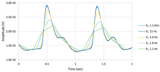 Digital low-pass filter effect on the PPG signal, where the signal lost its morphological structure if the cut-off frequency (fc) was set very close to the carrier frequency.