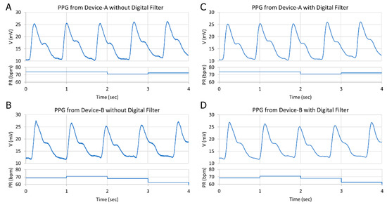 Comparison between the PPG signal from (A) Device-A without a digital filter; (B) Device-B without a digital filter; (C) Device-A after a digital filter; and (D) Device-B after a digital filter.