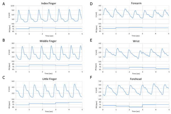 Comparison between the PPG signal on different parts of the body: (A) Index finger; (B) Middle finger; (C) Little finger; (D) The forearm; (E) The wrist; and (F) The forehead.