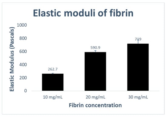 In the case of samples with concentrations of 30 mg/mL, a heavier indenter of 1/8″ tungsten carbide (density of 15.630 g/cm3) indenter was defined due to the high elastic modulus of this sample. As expected, with increase of fibrin concentration, elastic moduli values also increased.