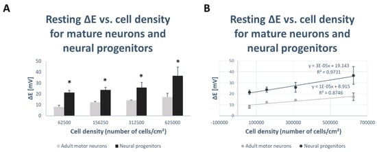 Mature human motor neuron cultures were tested in parallel with immature neural precursor cultures to validate the ability of our protocol to detect electrophysical maturation in neuronal cultures. Figure 3A shows that the motor neuron population possessed a significantly more hyperpolarized resting membrane potential than the immature neuron population, as expected, illustrating the ability of this protocol to reliably differentiate between electrophysically mature and immature resting membrane potentials in neuronal cultures. Furthermore, our protocol was consistent regardless of cell culture density. These values were then correlated with varying cell culture densities to note the relationship between the overall fluorescence with number of cells, since in a homogenous population such as this the relationship should be linear if the microplate is reading the dye reliably. Figure 3B shows that the relationship between ΔE and the cell density of the neural cultures is linear with a high correlation coefficient of 0.97 for the immature neurons, and 0.87 for the motor neurons, indicating that the microplate reader is indeed reading the dye in a reliable fashion.