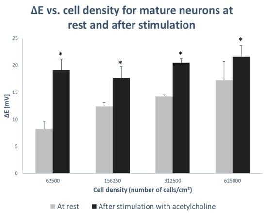 Microplate readings of mature neurons before and after stimulation. Data is presented as the average and standard deviation of three biological replicates. Statistics were performed by one-way paired student t-test. * signifies statistical significance between the After stimulation with acetylcholine readings versus the At rest readings.