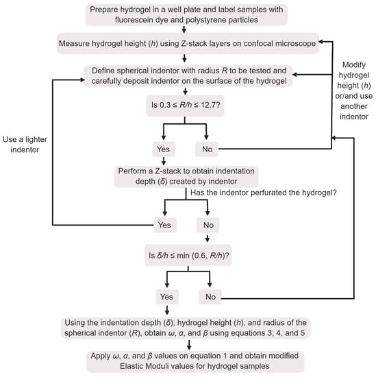 In order to obtain elastic modulus using this modified method, parameters such as indentation depth (δ), hydrogel thickness (h) and indenter radius (R) should be in the range of δ/h ≤ min (0.6, R/h) and 0.3 ≤ R/h ≤ 12.7 [].