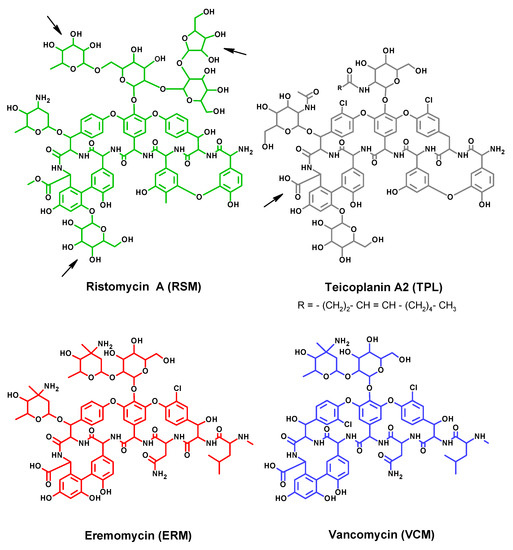 ERM is the nearest and more active analogue of VCM, isolated from a culture of Nocardia orientalis [20]. ERM has an additional glycoside substituent but lacks one chlorine atom, unlike VCM (Figure 1). TPL and RSM form another subgroup of glycopeptides, as their structures are more glycosylated and include a lipid substituent, in comparison with antibiotics from the VCM-group. RSM (also known as ristocetin) is produced by Amycolatopsis lurida [21]. At present, RSM has limited usage as a therapeutic agent because of its platelet agglutination activity. However, because of this feature, RSM has found usage in the diagnosis of hereditary haemorrhagic thrombocytopathies, von Willebrand disease, and Bernard–Soulier syndrome [22].