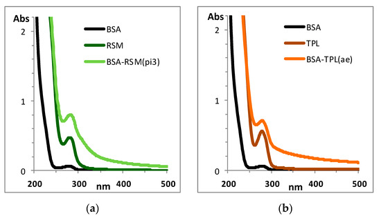 The formation of the prepared conjugates was confirmed by their UV spectra and also by immunizing capacity and immunochemical activity. The spectra of immunogens BSA-RSM (pi3) and BSA-TPL (ae) (Figure 2) showed an augmentation of typical peaks of RSM (λ = 280 nm) and TPL (λ = 278 nm) in comparison with BSA.