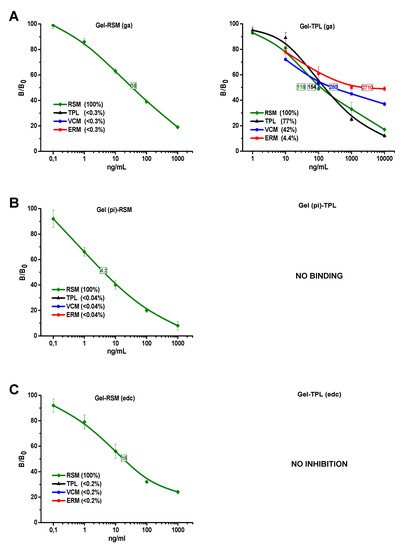 Critical change in assay specificity occurred when hapten in coating antigens was substituted with heterologous, TPL (Figure 3A–F, right column). Presentation of TPL molecules on the carrier allowed the selective binding of anti-RSM to structures common for RSM and TPL and even other representatives from this family of substances. Because of the various designs of TPL-conjugates, more optimal TPL orientation on the carrier, for broad specificity, could be found. However, two variants were found to be unsuitable. The spatial image of hapten in Gel(pi)-TPL was alien to such an extent that it could not bind to anti-BSA-RSM(pi3). Interaction with Gel-TPL(edc) was strong; however, it could not be inhibited by a free analyte.