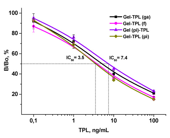 All four developed ELISAs were based on the TPL-coating antigens of heterologous conjugation (Figure 4). Although various conjugation methods could modify the TPL orientation on the protein, the homologous hapten-based antigens were not effective in changing the specificity of the assay. Their influence on the sensitivity of ELISAs was insignificant, making only two-fold changes (IC50 = 3.5–7.4 ng/mL). The comparable influence of hapten conjugation in RSM systems was more pronounced (IC50 = 4.2–35 ng/mL). The identified differences may be related to the repertoire of the specificity of the antibodies produced and, therefore, to the presentation of the immunizing hapten. The more unique the hapten presentation, the more uniform the specificity of antibodies, and the more constant their properties are in changing conditions, and vice versa.