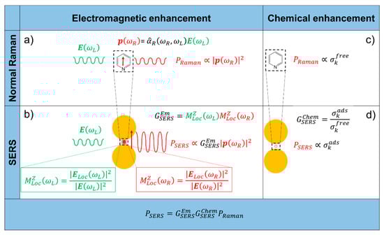 is called (total) SERS enhancement factor and accounts for the amplification induced by the substrate. The total SERS enhancement comprises two multiplicative contributions, the electromagnetic () and the chemical one (), whose features are summarized in the following and will be described in detail in the Section 2.1 and Section 2.2.