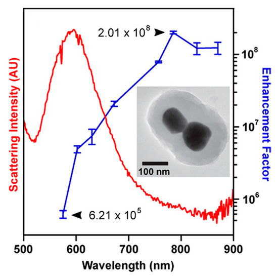 - Zhu, W.; Crozier, K.B. Quantum mechanical limit to plasmonic enhancement as observed by surface-enhanced Raman scattering. Nat. Commun. 2014, 5, 5228. [Google Scholar] [CrossRef]