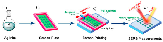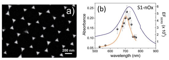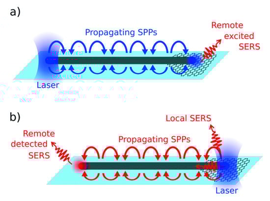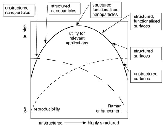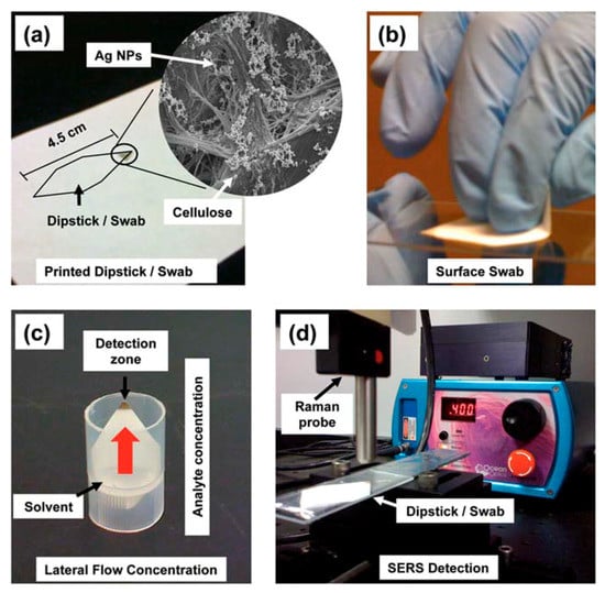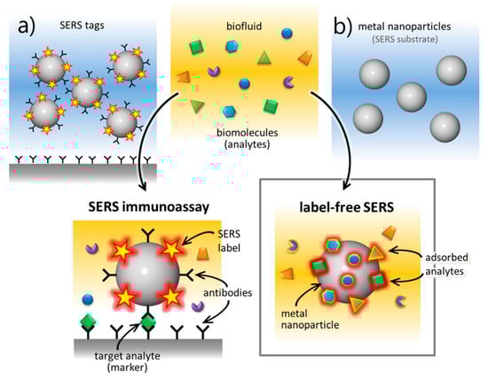 Surface-enhanced Raman scattering (SERS) was first observed in 1974 by Fleischmann et al. [1], who reported an unexpectedly large Raman signal from pyridine adsorbed on a roughened silver electrode. Before long, Jeanmaire and van Duyne [2] and Albrecht and Creighton [3] confirmed Fleishman’s findings and hypothesized that this phenomenon was originated by strong electrochemical electric fields at the metal surface (Jeanmaire) or by the formation of a molecule–metal complex (Albrecht); lately, Moskovits [4,5] proposed that the large signal was originated by the optical excitation of collective oscillations of the electrons in the metallic nanosized features at the surface. Studies in the following years confirmed that the origin of SERS enhancement is two-fold and is related to the electromagnetic [6,7,8] and to the chemical effect [6,8,9,10,11]: a reasonable maximum value for the total enhancement is around 10 orders of magnitude [12]. SERS; therefore, combines the intrinsic advantages of Raman ((a) recognition capabilities, owing to the vibrational fingerprints of molecules; (b) non-destructive analysis; (c) minimum preparation of the sample required; (d) possibility of carrying out measurements in biological fluids, since the water spectrum is rather weak; (e) simultaneous detection of different analytes (multiplexing); (f) possibility of carrying out on-site analysis with portable instruments) [13] with high sensitivity that, in some cases, can even allow single molecule detection [14,15,16,17].
