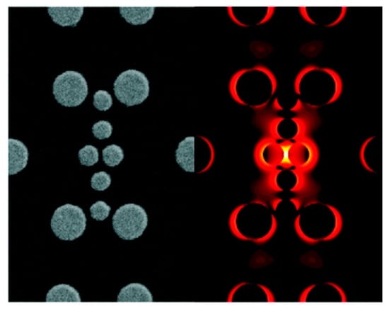 Nowadays, scientists are working on several aspects of SERS, for example, fundamental aspects related to the electromagnetic [7,12,22,23] or the chemical [9,10,24,25] enhancement mechanisms, single molecule detection [14,15,16,17], structure-property investigations aimed to investigate how the structure of a SERS substrate influences its optical response [26,27], tip enhanced Raman scattering (TERS) [28,29,30,31,32], and ultrafast SERS studies of molecular dynamics at the interface with metallic surfaces [33,34]. Another important field is the development of substrates with optimal characteristics for SERS; fabrication strategies have been reviewed in several papers [35,36,37,38,39] and comprise, for example, wet chemical protocols [40], the assembly of nanoparticles on different types of surfaces [41,42], and the fabrication of ordered arrays of nanoparticles [43,44,45,46]. Analytical aspects of SERS, like the coupling with separation techniques (gas, liquid, thin layer chromatography, etc.) have been recently reviewed [47], as well as the issues involved in the quantitative determination of analytes [48,49,50,51,52,53]. Concerning applications, SERS has been used for the detection of food additives or contaminants [54,55,56,57], explosives and warfare agents [58], biological species [59,60,61,62,63,64,65,66,67,68,69,70,71,72,73,74,75,76], in forensic science [77], and to monitor reactions catalyzed by metallic surfaces [78] or nanoparticles [79]. General overviews on SERS can be found in books [6,8,80,81,82,83,84], Faraday discussions [85,86,87,88,89], special issues [90,91,92,93], and reviews [7,9,36,76,94,95,96,97,98]. Finally, it is worth mentioning that the plasmonic amplification of the optical response has been exploited to enhance also coherent anti-Stokes Raman scattering (CARS) [99,100], stimulated Raman scattering (SRS) [101,102], hyper Raman scattering (HRS) [75,103,104,105], fluorescence [106,107,108,109], and infrared absorption [8,110].