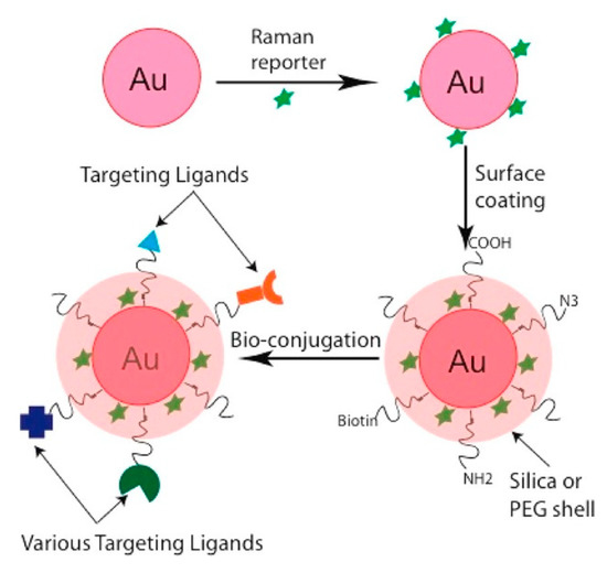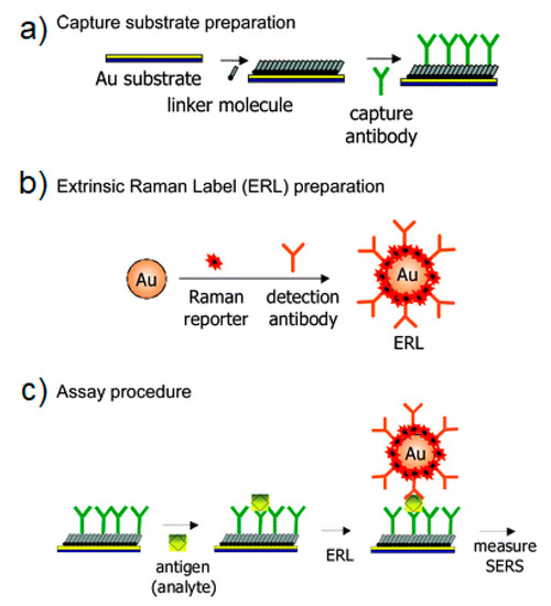 - Xu, S.; Ji, X.; Xu, W.; Li, X.; Wang, L.; Bai, Y.; Zhao, B.; Ozaki, Y. Immunoassay using probe-labelling immunogold nanoparticles with silver staining enhancement via surface-enhanced Raman scattering. Analyst 2004, 129, 63–68. [Google Scholar] [CrossRef] [PubMed]