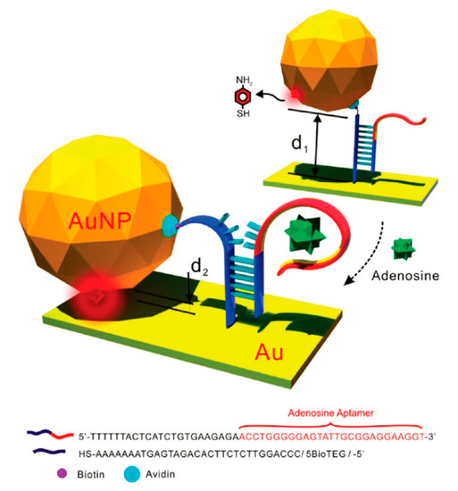 - Kim, N.H.; Lee, S.J.; Moskovits, M. Aptamer-mediated surface-enhanced raman spectroscopy intensity amplification. Nano Lett. 2010, 10, 4181–4185. [Google Scholar] [CrossRef] [PubMed]