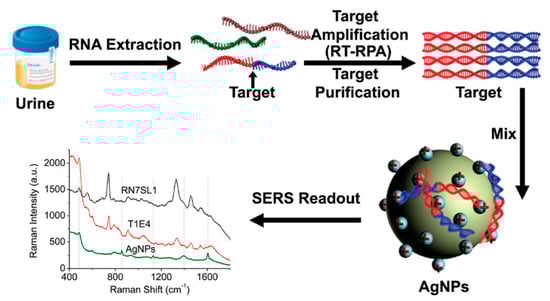 - Driskell, J.D.; Seto, A.G.; Jones, L.P.; Jokela, S.; Dluhy, R.A.; Zhao, Y.P.; Tripp, R.A. Rapid microRNA (miRNA) detection and classification via surface-enhanced Raman spectroscopy (SERS). Biosens. Bioelectron. 2008, 24, 917–922. [Google Scholar] [CrossRef]