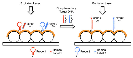 - Wei, X.; Su, S.; Guo, Y.; Jiang, X.; Zhong, Y.; Su, Y.; Fan, C.; Lee, S.T.; He, Y. A molecular beacon-based signal-off surface-enhanced Raman scattering strategy for highly sensitive, reproducible, and multiplexed DNA detection. Small 2013, 9, 2493–2499. [Google Scholar] [CrossRef]