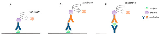 Schematic presentation of basic strategies of ELISA: (a) the direct ELISA, (b) the indirect Elisa, and (c) sandwich ELISA.