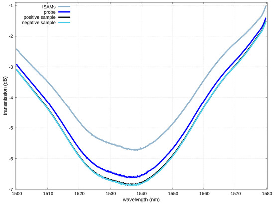 Transmission spectra after different steps of the assay. Adding the probe to the ISAM-coated fiber caused a large increase in attenuation. The attenuation was further increased after exposing the sensor to the positive control. However, further exposure of the fiber to the negative control did not result in any further change in attenuation, as was expected. As a result, the negative control spectrum overlaps and is indistinguishable from that of the positive control.