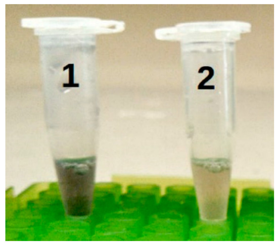 Magnetic bead ELISA. All tubes contained the beads, biotinylated probe of IS711 gene, and digoxigenin-labelled probe to a distinct IS711 DNA region. Tube 1 contained the PCR amplicon from a lysate of 7 × 106 cells of Brucella abortus. Tube 2 contained all the reaction components of tube 1, but the genomic DNA was not amplified by PCR.