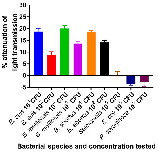 Reaction of the ISAM/probe (IS711) duplex with the entire 25 µL of PCR amplicons from a lysate representing 104 cells of B. abortus strain 2308, B. melitensis strain 16 M, or B. suis strain 1330 in 500 µL of PBS resulted in 18.7%, 18.6% and 20.11% attenuation of light transmission, respectively, with positive results being above 0.6% light attenuation. When lysate from 102 cells of these same nomenspecies were tested, 8.8%, 14.2% and 13.6% attenuation of light transmission was obtained, respectively (Figure 5). These results indicated that the NOFS assay was capable of detecting PCR products with at least 102 cells of Brucella, which is much lower than the number of cells that could be detected by gel electrophoresis or ELISA. In contrast, when lysate from 104 cells of P. aeruginosa, E. coli, or S. Typhimurium were tested by the NOFS assay following PCR, less than 0.2% attenuation of transmission was obtained for any of the non-Brucella species tested (Figure 5).
