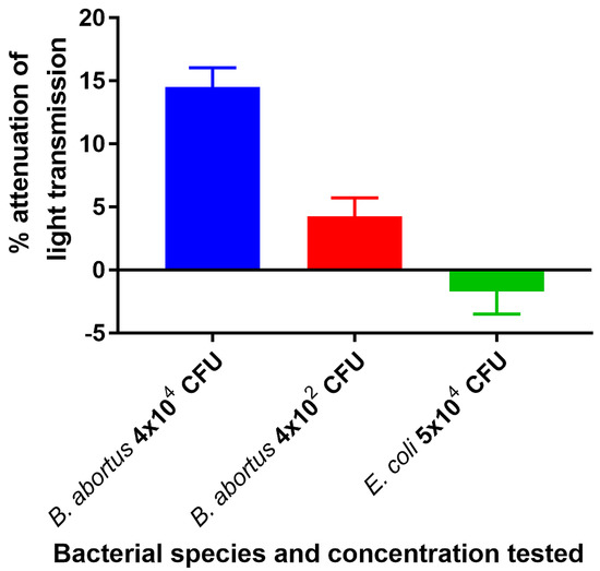 Reaction of the ISAM/IS711 probe duplex containing streptavidin with lysate representing 4 × 102 or 4 × 104 cells of heat-killed B. abortus without the use of PCR resulted in 4.3% and 14.5% transmission attenuation, respectively. Reaction of the same duplex lysate representing 5 × 104 cells of heat-killed E. coli failed to produce a positive transmission attenuation (Figure 6). These results confirmed that the assay could specifically detect low numbers of Brucella without the use of PCR.