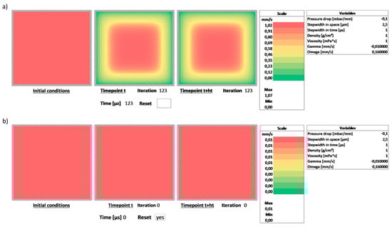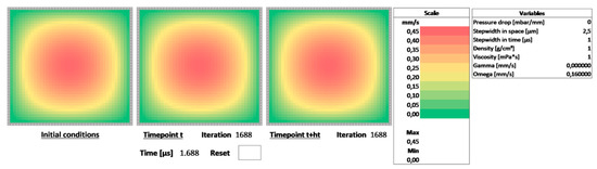 The scheme given by Equation (9) was implemented in Microsoft Excel in a spreadsheet, which can be downloaded from the supporting material (file “TimedependentMicrofluidicFlows.xlsx”). It is shown in Figure 1. The numerical domain was chosen as a 40 × 40 cell grid panel with no-slip boundary conditions. As demonstrated in an earlier contribution, different boundary conditions can be implemented such as, e.g., flip or Neumann-type boundary conditions []. The values in the cells represent the velocity of the flow at the given position in the domain. The sheet consists of three panels: