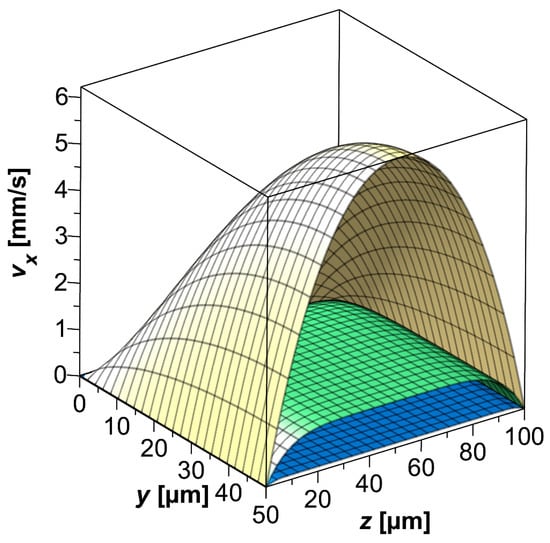 Velocity profile calculated from the analytical solution of Equation (30) for water as fluid and a channel with 100 μm width and 100 μm height. The Fourier series is expanded to . The expansion order of the Fourier series was 10 both along and . Velocity profiles for different points in time are plotted: 10 μs (dark blue), 100 μs (medium green) and 1000 μs (light yellow).