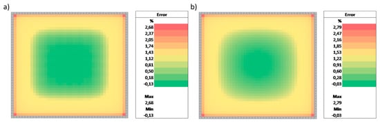 Comparison of the results obtained from the numerical scheme implemented in Microsoft Excel against the analytical solution of Equation (30) for time point 100 μs (a) and 1000 μs (b). The graphs show the relative error. Both cases show very good agreements with maximum errors below 3%.