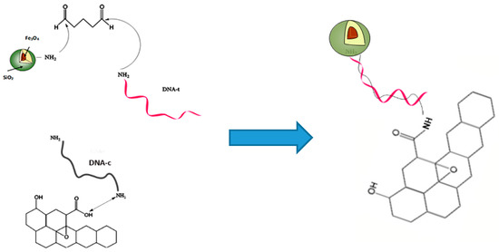 Figure 1 shows the covalent interaction between MFNPs and DNA-t with 5′-end modification through glutaraldehyde crosslinking. The complementary oligonucleotide, i.e., capture DNA (DNA-c), is modified with the amine group where it can interact with the functional group, −COOH, on GO. When DNA hybridization occurs, the fluorescence intensity of the donor, e.g., FMNPs, will be supressed by the quencher, GO. The correlation of fluorescence quenching and the level of DNA hybridization can determine how much DNA-t is in a system.