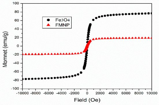Figure 2). Furthermore, the core-shell FMNPs had an average particles size of 74 ± 6 nm and the average thickness of the silica shell, estimated from TEM results, was 30 ± 4 nm.