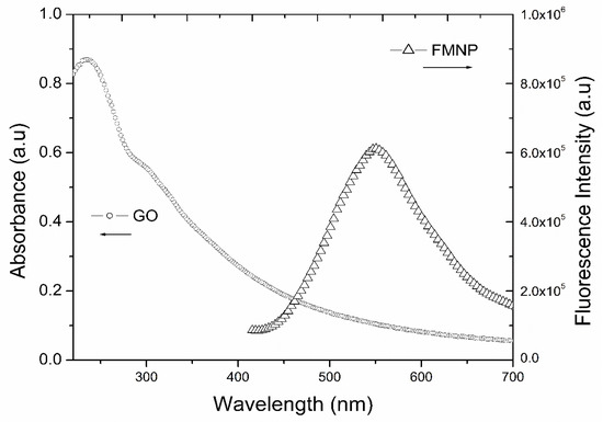 21]. It is also noted that the broad absorbance of GO covers the major emission range of FMNPs with the maximum fluorescence intensity centering at 575 nm.