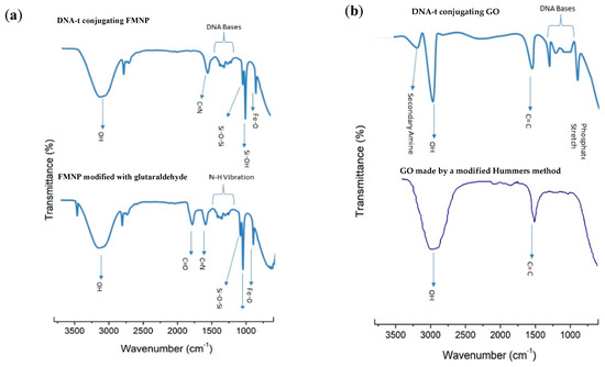 In addition, the FTIR spectra of glutaraldehyde-modified FMNPs and FMNPs modified with DNA-t are displayed in