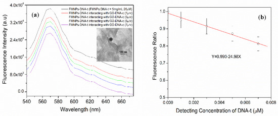 Figure 7b is the fluorescence ratio as a function of the concentration of the detected DNA-t. Here, the fluorescence ratio refers the normalized fluorescence intensity, i.e., dividing the fluorescence intensity of FMNPs-DNA-t reacting with GO-DNA-c by that of the FMNPs-DNA-t. The regression equation is expressed as y = 0.99 − 24.98x with a correlation coefficient R