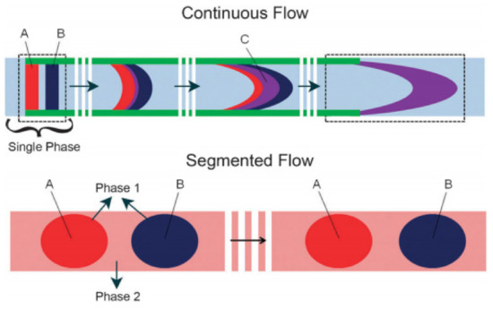 In 1953, Taylor dispersion was described as “the combined action of molecular diffusion and the variation of velocity over the cross section” [6]. Because of this dispersive phenomena, the distance that chemical signals (variation in concentration with time and space) or analytes can be transported in the continuous phase is severely limited [6,7]. The top part of Figure 1 shows pulses of imaginary chemical A and chemical B. Initially, the pulses are separated from one another, but after a short distance the chemical pulses have merged and spread out [8]. In contrast, the bottom part of Figure 1 [8] shows that pulses of chemical A and B, when contained in droplets are not dispersed or merged after transport. The sampling of tiny volumes of aqueous body fluids and their transport to systems for precise detection or quantification is an ongoing area of activity in biomedical research [9,10,11,12,13,14,15,16,17,18,19,20,21,22,23,24,25].